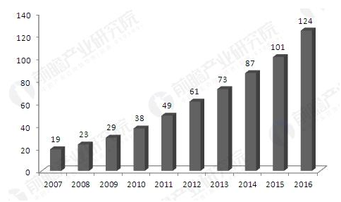 2007-2016年中國智能照明行業市場規模(單位:億元)